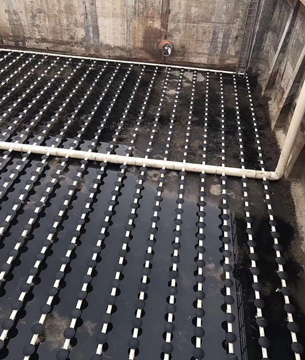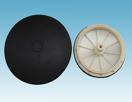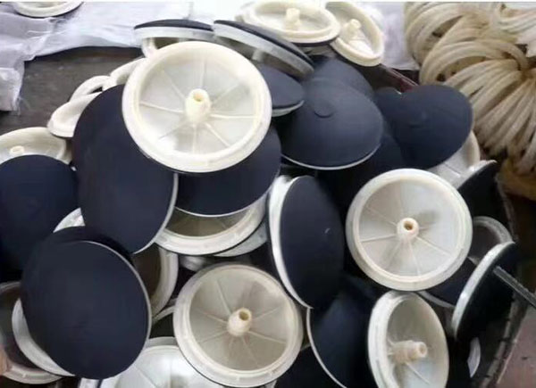 膜片式微孔曝氣器是80年代研制的新型曝氣裝置,該裝置曝氣氣泡小、氣液面積大,氣泡擴散均勻,不會產生孔眼堵塞,耐腐蝕性強。但通過多年的運行出現了一些難以解決的不足。如:膜片脫落、膜片撕裂、膜片打不開、污泥進入支氣管等問題。因此該公司研究開發部與外許多院校和科研單位合作吸收經驗攻克了各項技術難關,對膜片曝氣器進行了改革,研制開發了二十一世紀水平的新一代盤式膜片微孔曝氣器。